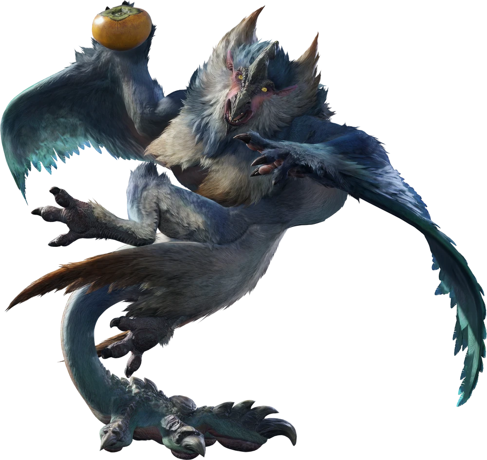 Bishatenbeast. The majority of its body is coated in cream-colored fur, with blue fur covering its limbs and legs. Like its relative Kecha Wacha, Bishaten possesses patagia on its arms, which it uses to construct wings that it can fly around on. These patagia are held up by a single wing finger and coated in feathers that have a cyan tint. Its limbs terminate in five fingers: four of them are small fingers with black claws, and one is the wing finger. Its thumb is likewise opposable. Only three of its legs' fingers, though, terminate in claws like to these. But Bishaten's "fifth limb" is its most unusual characteristic. Like Great Maccao and Somnacanth, Bishaten possesses a powerful tail that can sustain its entire body weight. Moreover, its tail terminates in a "hand" with five "digits". Located in the middle, with two smaller lobes on either side, is the largest lobe. Hard shells cover a portion of the tail hand. Bishaten utilizes the pouch on his abdomen to store a lot of different types of fruits. There is a lengthy white fur patch over the legs that resembles a tiny set of wings or a bird's tail. The fur becomes brown at the edge. With a big, bony protrusion between its eyes and a smaller one on its forehead, Bishaten has a peculiar facial structure. It's interesting to note that the top jaw contains nostril holes, and both have a bony, beak-like protrusion at the front. Its ears are likewise quite big. A mane of blue and white fur covers its neck; females of the species have manes much smaller than this one.