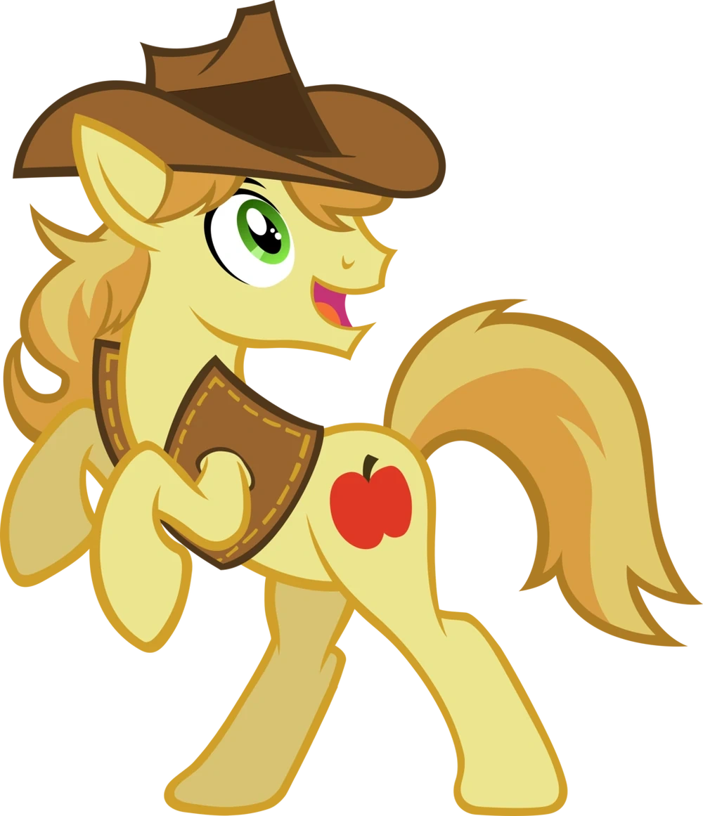 He is an amber yellow stallion who has an orange amber mane and tail, as well as having green eyes. He also wears a brown cowboy hat and a brown vest. His cutie mark is shown to be a single red apple.