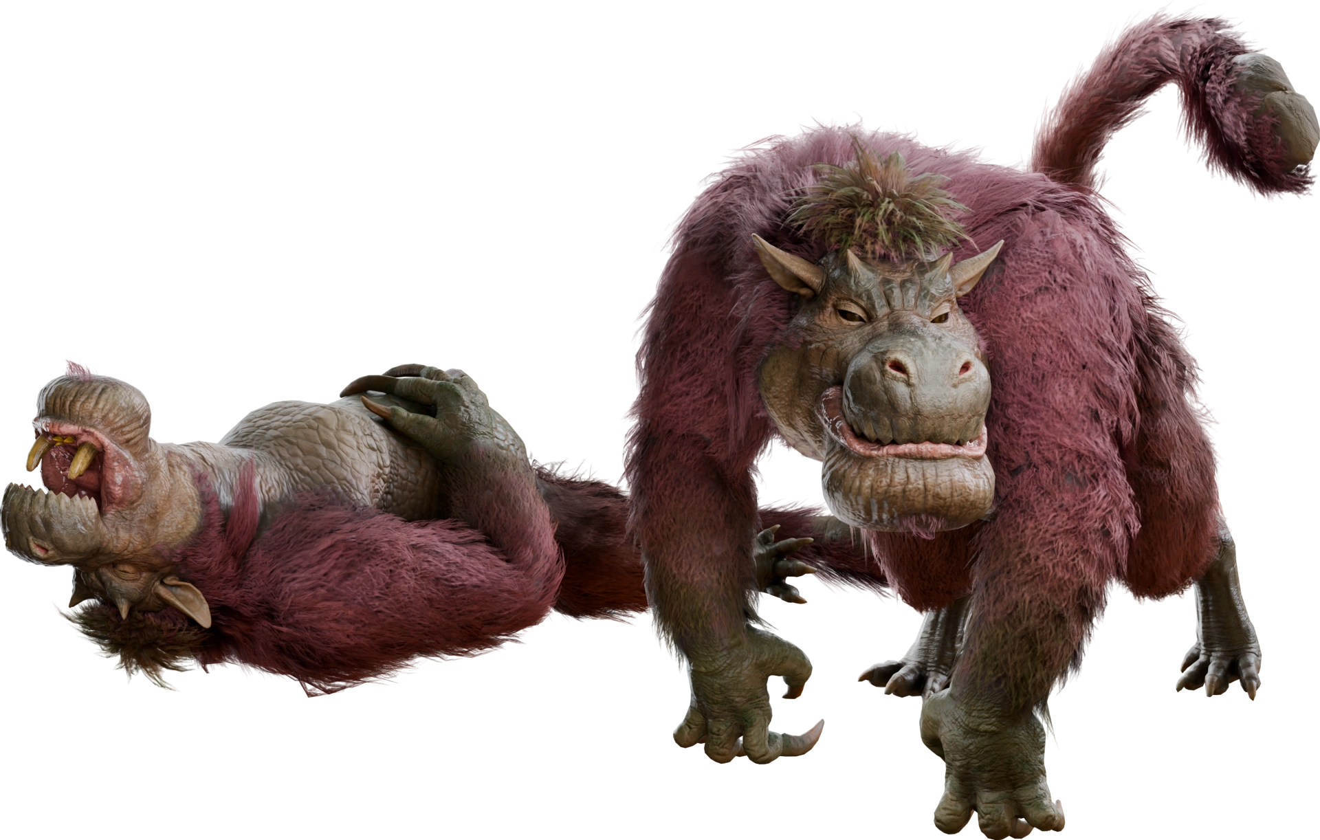 Omnivorous and gluttonous beasts, Conga prowl their rainforest homes in a constant search for food, devouring anything they can get their hands upon. They aren't especially picky but favour mushrooms above all other food sources, gorging themselves on the fungi whenever possible. As rather weak monsters, Conga prefer not to get into fights, instead standing up on their hind legs to scare away predators and using their farts as a last resort. They will also form groups for safety, herding around their alpha, a Congalala. These groups don't actually cooperate during battle, instead only serving to increase the efficiency of foraging and to scare away predators that may be seeking an easy meal.