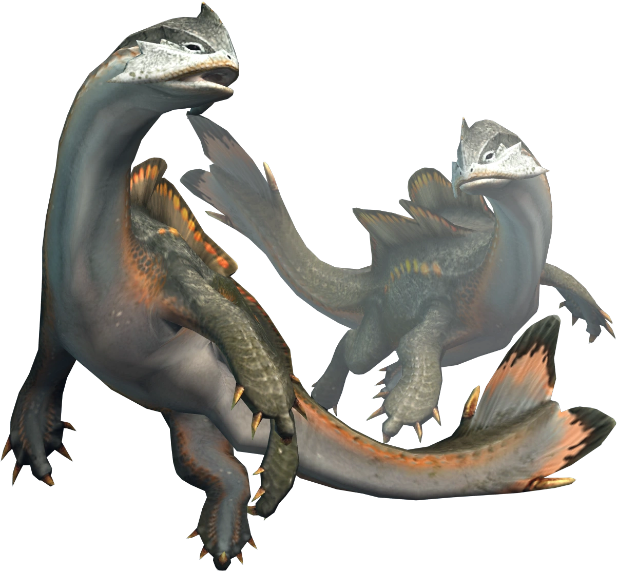 Fish-like is the epioth's appearance. They have four flippers, each with spines around the end and a little nub on the tip. In the center of their back are two medium-sized fins. They feature two tiny spikes immediately above and below each fin on their fish-shaped tails. The upper half of the epioth's body is green, while its necks and bellies are white. Their flanks, flippers, and fins all have orange accents.