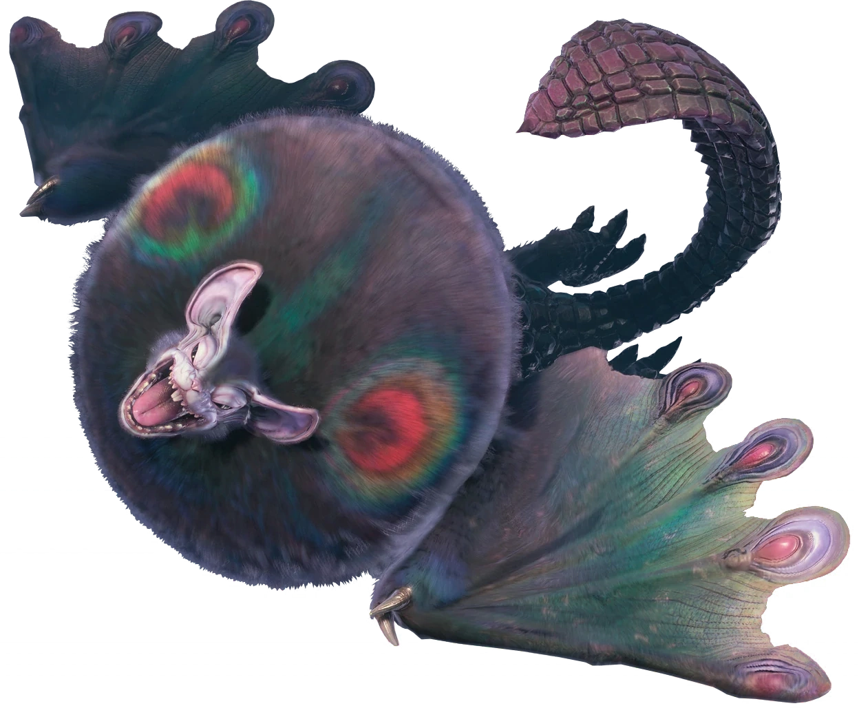 Nightshade Paolumu is a big Flying Wyvern that looks like a bat, just like the regular Paolumu. The velvety fur covering its body is mostly dark purple or black, in contrast to the white-and-pink coloring of its normal cousin. In keeping with the hue of its fur, its tail is equally dark. It has a creamy white face and two vividly colorful patches on its neck that resemble the patterns on a peacock's tail feathers. These spots are harder to see when it is deflated. There are subtle green undertones on the webbing of its wings.