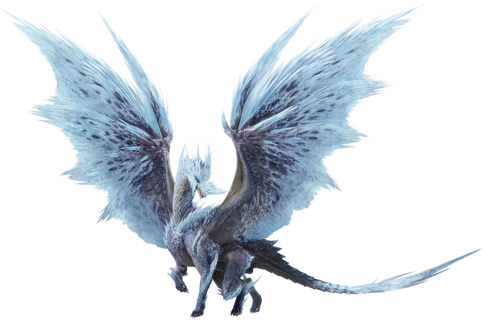 Velkhana has the same basic shape as most other elder dragons: four legs and two wings on its back. Velkhana's wings are massive, estimated to be about twenty meters long, and these extra limbs aid it in its flight. Covering Velkhana's entire body is overlapping feather-like scales that one might immediately think is how Velkhana keeps itself warm in the cold environments it inhabits, but that isn't the case. At the very tip of its wings is a small amount of fat that allows cold air to enter its body and, much like waterfowl, it uses countercurrent heat exchange to keep itself warm in such environments, losing little heat in the process. In contrast to other elder dragons, Velkhana rarely uses its claws in battle because they are crucial to its movements; its hook-like claws are used to grip the icy floor of its habitat, preventing Velkhana from slipping on the snow and ice that litters its turf. Instead of using its claws, Velkhana primarily uses its spear-like tail in combat against threats, impaling its enemies several times with great speed and accuracy. Although Velkhana's entire body is covered in scales, the blue shards on its body aren't scales; they are a type of ore that resembles volcanic glass, which Velkhana uses to control its fabled icy abilities.