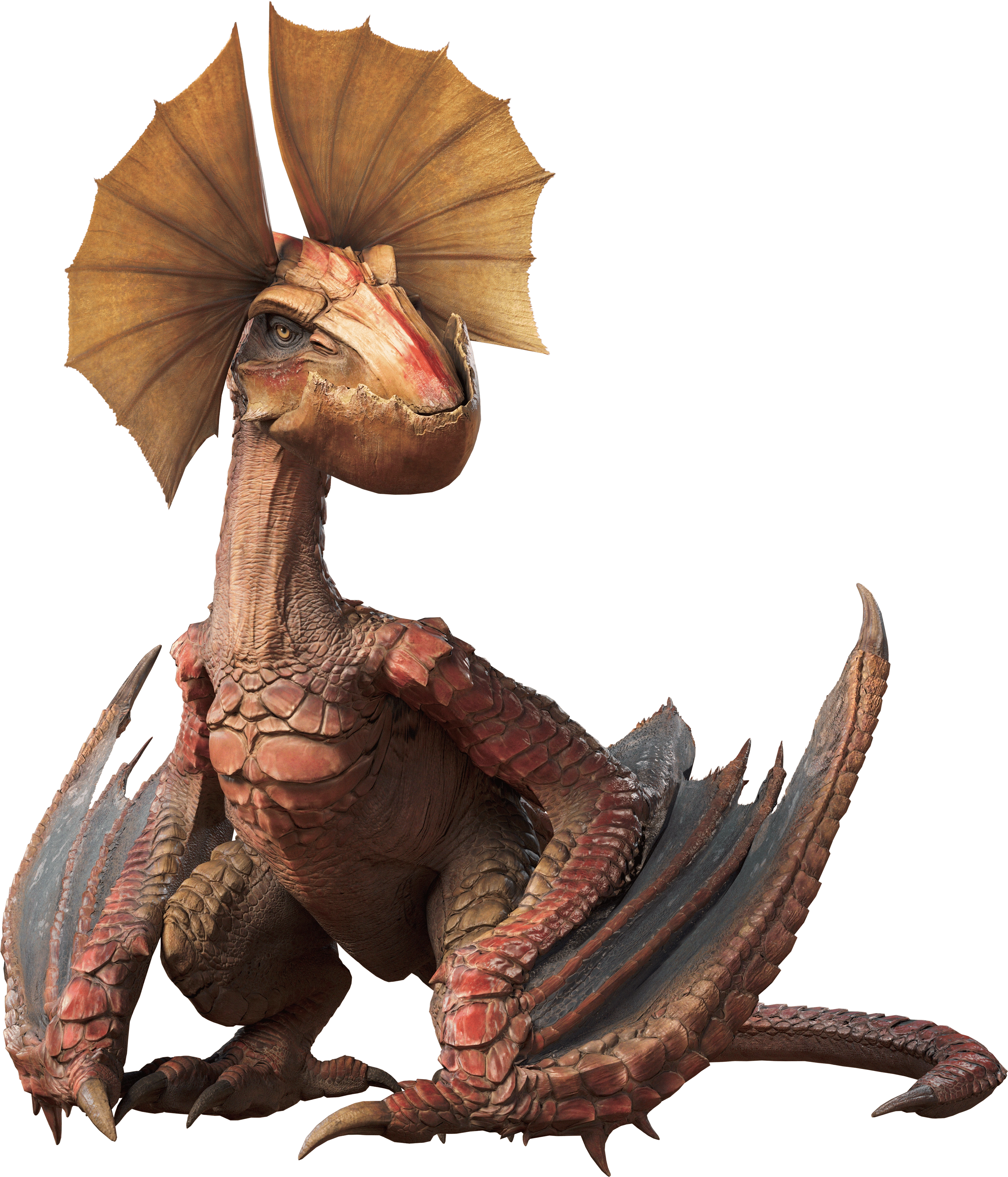 The Yian Kut-Ku is distinguished by its larger lower bill and enormous, fan-like ear frills that unfold when it gets aroused. Their broad yellow beak has a pink stripe going down the middle of the upper part of it. Its beak's lower jaw is noticeably bigger and heavier than the upper jaw. Beige scales and orange-pink plating cover Yian Kut-Ku's body. Its eyes are brilliant yellow, and its wing membranes are a deep blue color. These wyverns are swift and nimble due to their tiny size and relative lightness. The big frills that around their ears give them a very keen sense of hearing.